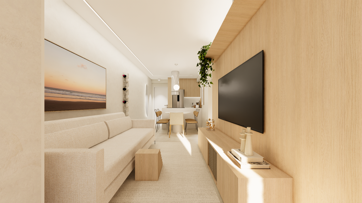A paleta de cores é um convite ao conforto: tons claros, como o branco e o bege, se unem à madeira clara para aconchego, criando uma atmosfera de refúgio que era uma prioridade para a moradora. O perfil de LED que vai da cozinha à sala cria uma iluminação indireta e mais amena, valorizando a textura da parede da Coral e dando unidade visual.