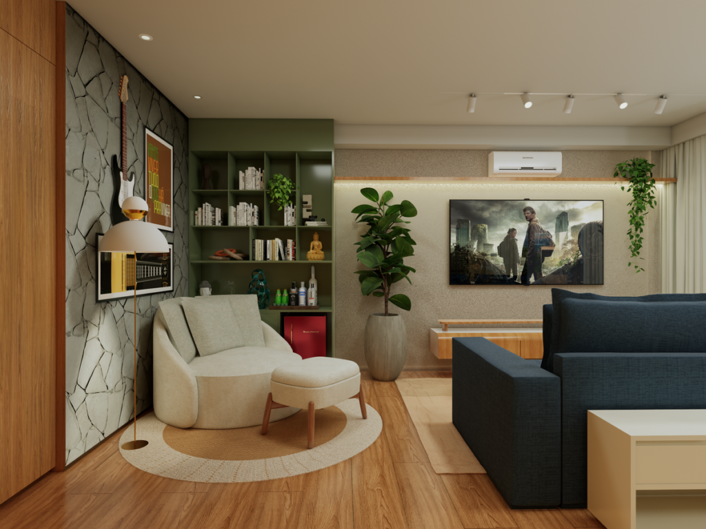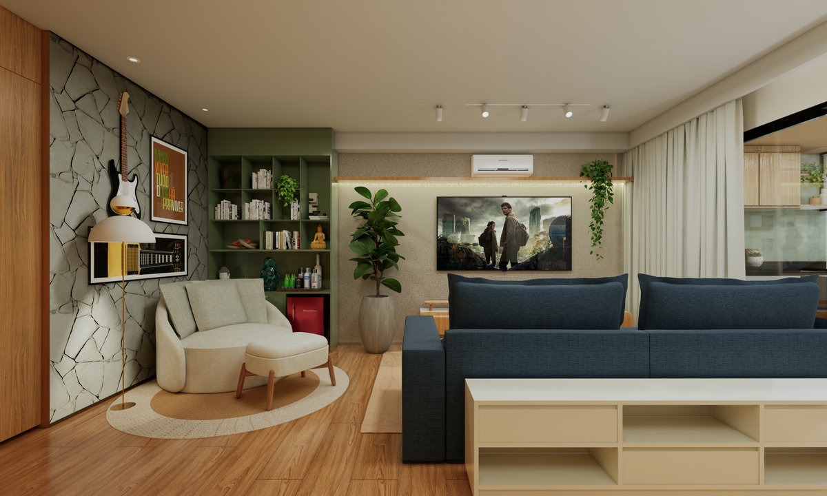 Na sala de TV, o reaproveitamento do sofá existente dos clientes ganhou um novo fôlego com o contraste de um tom verde elegante. O ambiente também foi pensado para acomodar os instrumentos musicais do Gustavo, integrando sua paixão pela música à decoração de forma harmônica e organizada. O resultado é uma sala que conta histórias através de objetos afetivos e quadros cuidadosamente selecionados.