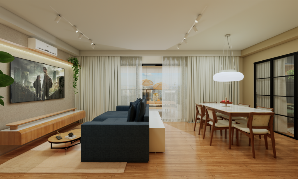 A área social é o coração deste lar, onde os tons neutros servem de base para cores pontuais e texturas naturais. A integração é um dos pontos fortes, permitindo que a luz natural circule livremente entre o living e a varanda. Para trazer essa sensação de acolhimento, os arquitetos utilizaram a pedra moledo em uma das paredes, conferindo uma tonalidade suave que combina perfeitamente com o mobiliário moderno.