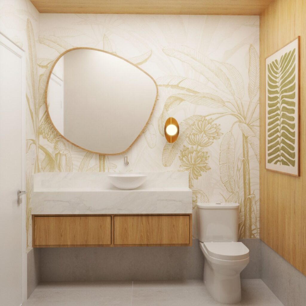 O lavabo deste Projeto de Interiores Apartamento na Vila Romana em SP foi tratado como uma verdadeira obra de arte. O destaque absoluto é o papel de parede com estampa de folhas de bananeira, que reforça o conceito de brasilidade presente em todo o imóvel. A bancada em mármore e o espelho orgânico completam o cenário, transformando um espaço funcional em um ponto de surpresa para as visitas.