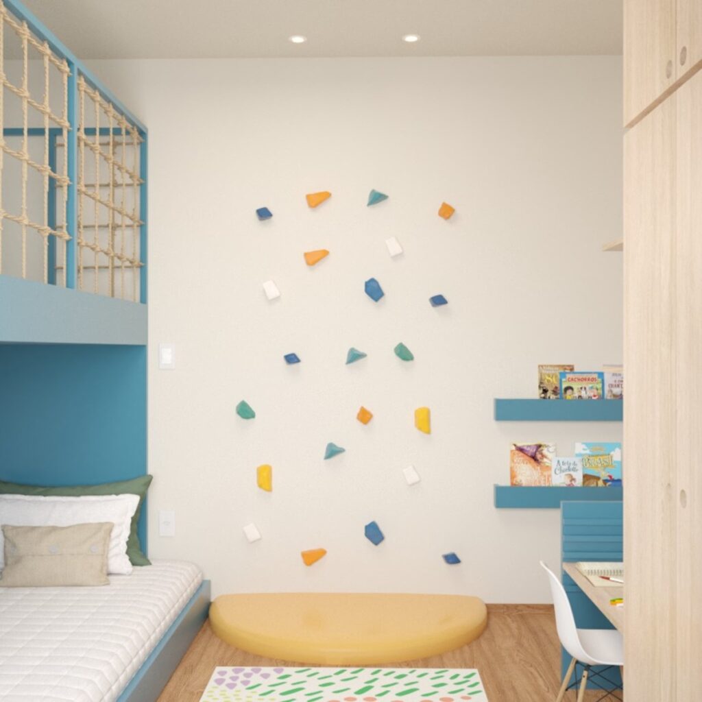 Para o quarto do filho, Caetano, a segurança e a diversão andam juntas. O projeto manteve a cama existente, mas adicionou elementos dinâmicos como uma parede de escalada colorida e um mezanino com rede de proteção. O azul vibrante da marcenaria, misturado à madeira clara, estimula a criatividade enquanto organiza os brinquedos e roupas de forma eficiente.