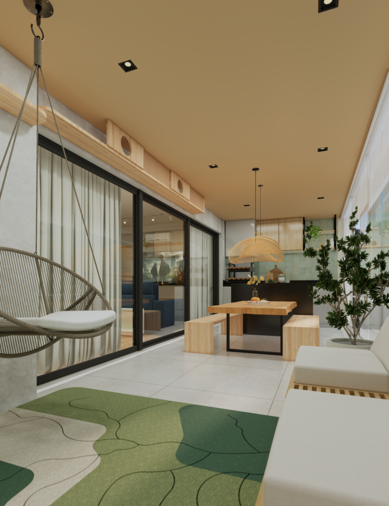 Na varanda, a intenção foi criar uma conexão direta com a natureza no meio da metrópole. O paisagismo denso e o uso de fibras naturais nos lustres e assentos proporcionam o relaxamento ideal após um dia agitado.