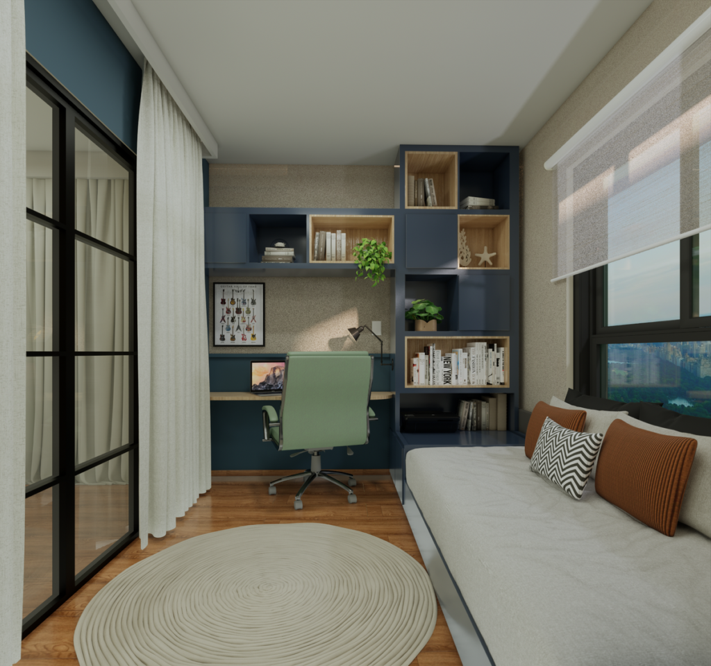 O apartamento conta ainda com um espaço híbrido que funciona como home office, estúdio e quarto de hóspedes. Um sofá-cama versátil permite receber visitas sem comprometer a rotina de trabalho da Pollyana e do Gustavo.