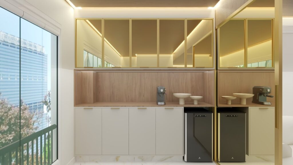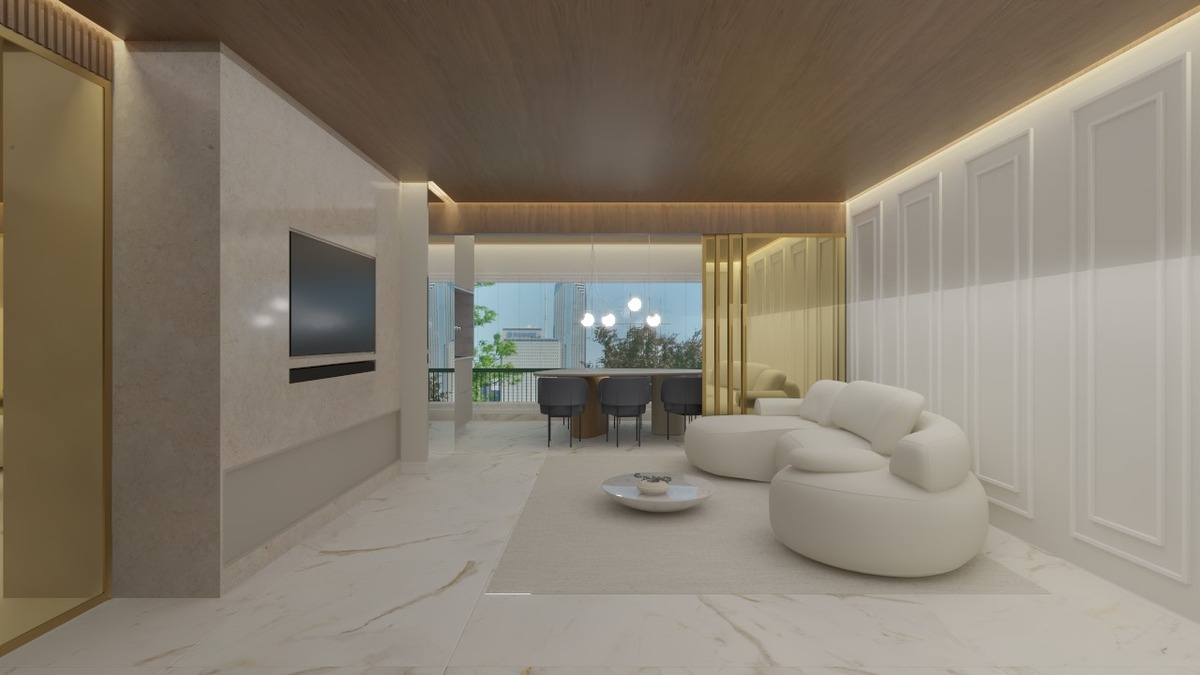 A base deste Projeto de Interiores Living Hectare no Anália Franco em SP é a integração total da área social. A retirada de barreiras visuais permitiu que o living se conectasse de forma fluida à varanda gourmet, criando um espaço amplo para recepção e convívio. Portas de vidro espelhado garantem a privacidade quando necessário, sem bloquear a entrada de iluminação natural que banha o porcelanato marmorizado do piso.