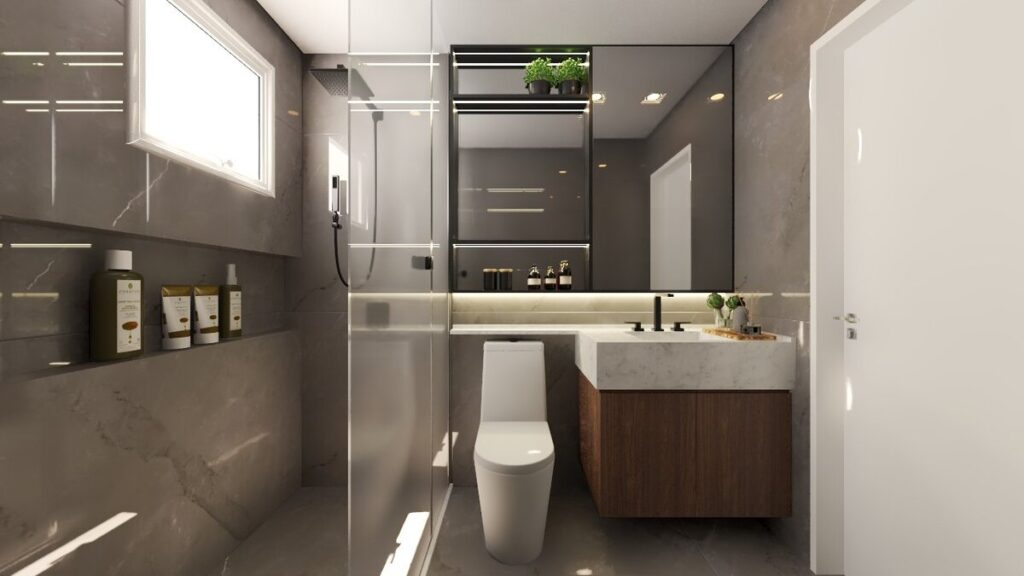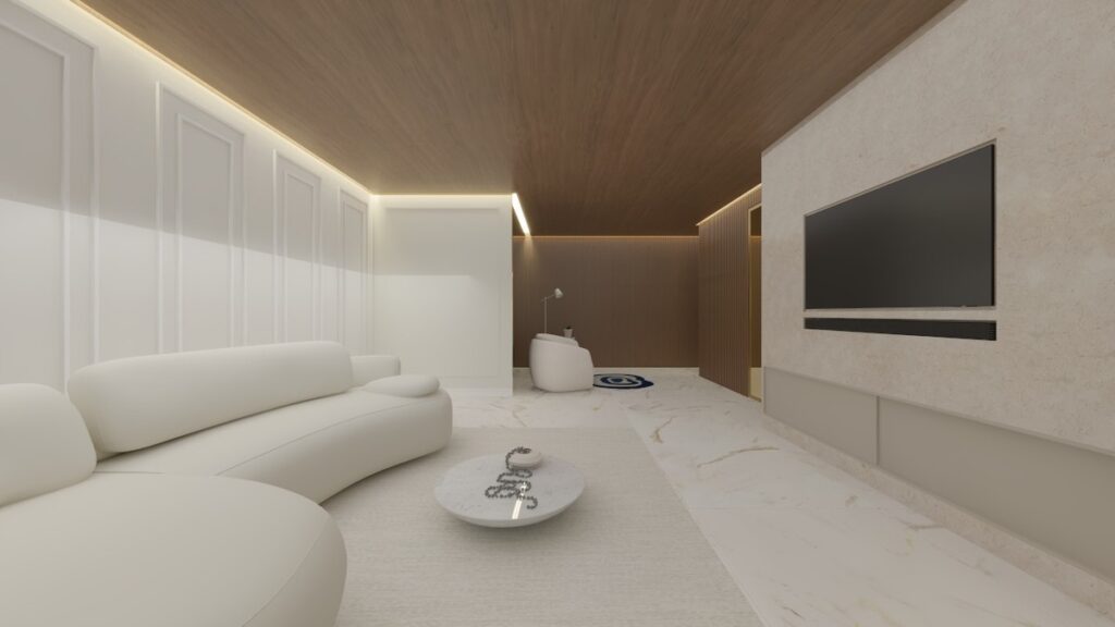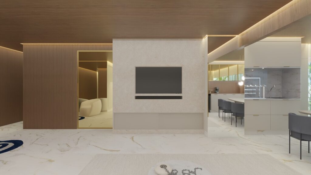 A paleta de materiais foi escolhida a dedo para elevar o padrão estético do imóvel. O forro de madeira percorre o teto da área social, criando uma moldura quente que contrasta com a frieza elegante do mármore presente nas bancadas e painéis. No lavabo e nos banheiros, as cubas esculpidas em pedra reforçam o cuidado com o acabamento e a busca por um visual minimalista e luxuoso.