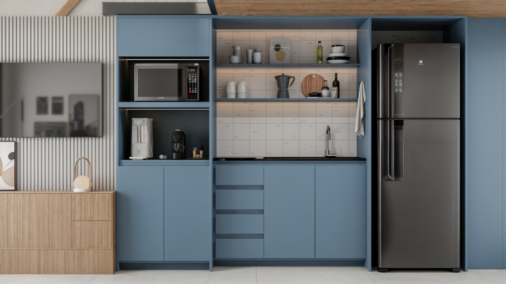 A marcenaria criativa delimita a cozinha logo na entrada, utilizando um azul marcante que define bem os espaços. Esse bloco organiza o micro-ondas, purificador de água e cafeteira, além de embutir a geladeira. Os arquitetos também pensaram na praticidade cotidiana ao prever um armário específico para itens de limpeza.