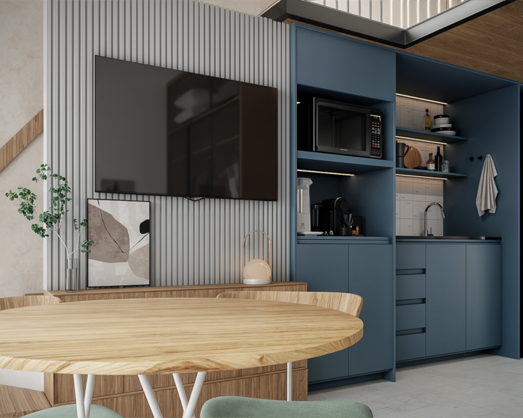O charme especial da cozinha fica por conta do revestimento acima da bancada. São azulejos brancos 15x15 com palavras de mensagens positivas e terapêuticas, criando uma conexão sensorial com o hóspede. Ao avançar pelo corredor, a cor da marcenaria transita do azul para o cinza, sinalizando sutilmente a mudança para a área de estar.