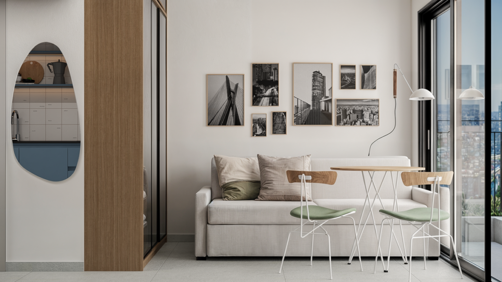 Na sala de estar, um sofá confortável divide espaço com a "Galeria São Paulo". Este conjunto de quadros traz imagens da cidade e do Brooklyn, reforçando a identidade local do Projeto de Interiores Studio 25M² Moderno em São Paulo. Uma pequena mesa versátil serve tanto para refeições quanto como estação de trabalho, sendo facilmente movida conforme a necessidade do hóspede.