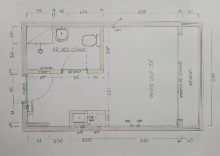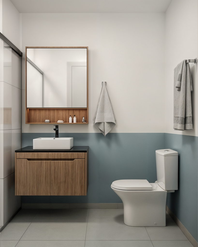 Até o banheiro recebeu atenção especial para manter a linguagem visual do estúdio. As cores verde e azul trazem calma e relaxamento, combinadas com uma iluminação direta na marcenaria do espelho. A cuba de apoio e os metais pretos finalizam o visual com sofisticação. Com um orçamento de 60 mil reais, o Projeto de Interiores Studio 25M² Moderno em São Paulo prova que é possível aliar alto design à rentabilidade para locação.