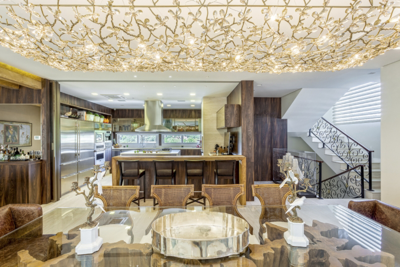 Sala de jantar - O lustre de cristal da Scatto Lampadário emoldura a sala de jantar. A madeira de demolição na bancada e no teto contrastam com o mobiliário clássico da Artefacto, que inclui cadeiras e bancos em fibra e revestimento de couro. A cozinha gourmet, ao fundo, é automatizada e tem ilha com coifa industrial, eletrônicos, madeira escura e vidro refletivo | Gazeta do Povo