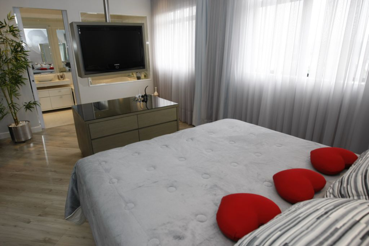 No apartamento do economista Valderi Câmara e da promotora Adriana Rabelo Câmara, a parte íntima, assim como a sala, também foi completamente reformulada pela arquiteta Ivana Malczewski. “Dois dos quatro quartos do apartamento foram unidos para formar uma suíte para o casal e o terceiro transformou-se em escritório”, diz Ivana. O banheiro do quarto de casal tem uma janela de vidro, em cima da hidromassagem, que dá para o dormitório. Entre o banheiro e a cama há uma tevê de LCD com um suporte que permite girar o equipamento para os dois ambientes.