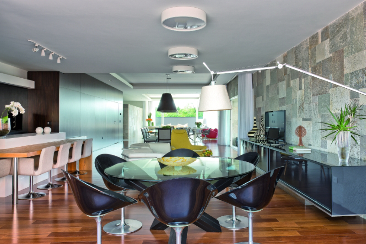 A residência, localizada em um luxuoso condomínio em Curitiba, tem um generoso pé direito de 3 metros e dispõe de uma definição volumétrica imponente. Do lado de fora, o conceito dá as caras com as linhas retas e contemporâneas. Mas é ao abrir a porta que se percebe a continuidade da proposta: integração de espaços, janelas enormes, base neutra e pontos de cor, móveis de design e conforto.