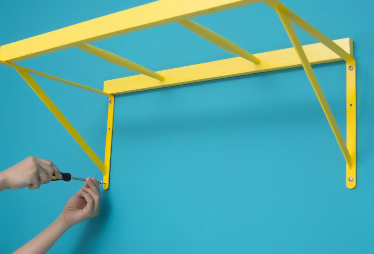 Faça os furos na parede e fixe a mão francesa na escada. Depois, parafuse-a na parede.