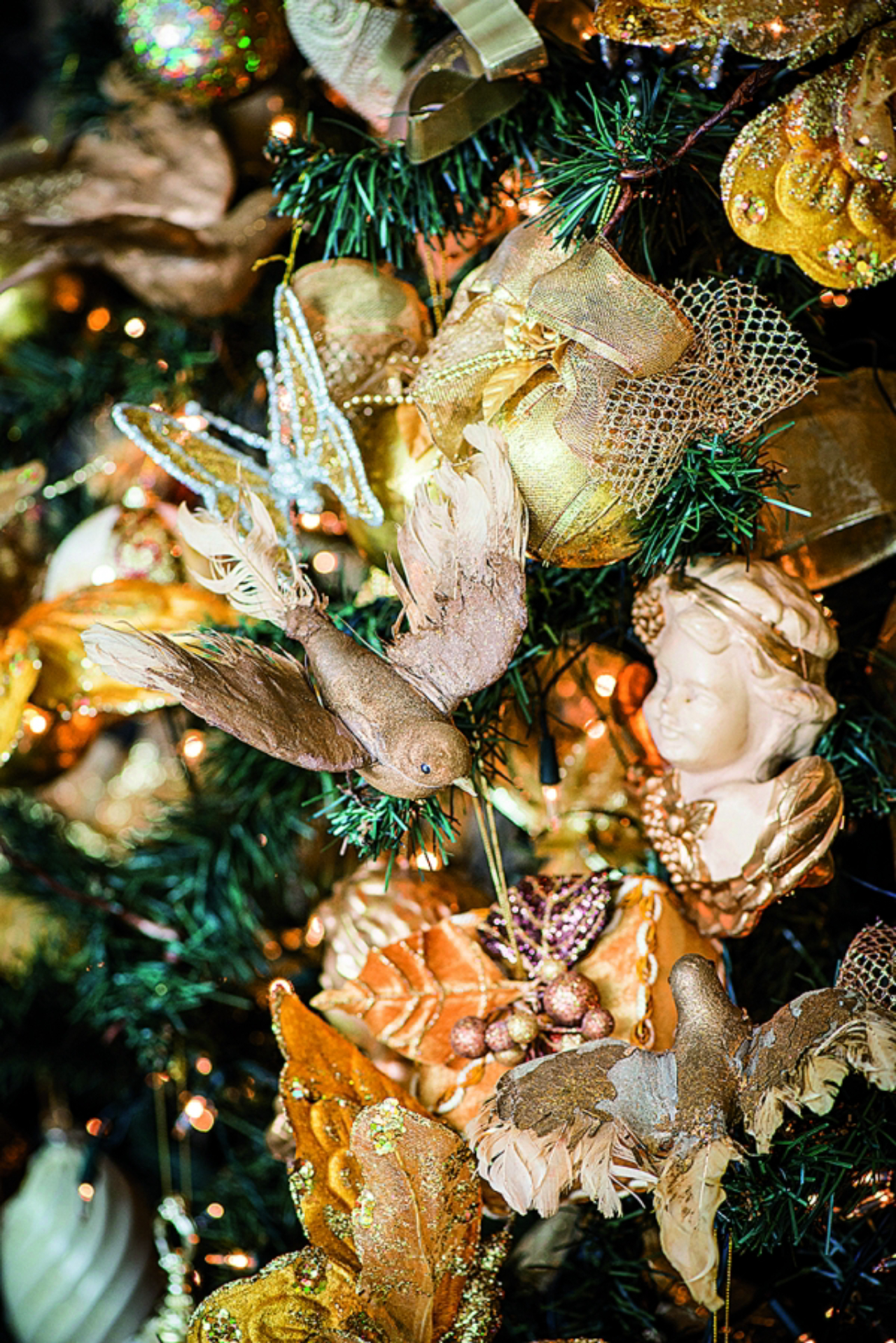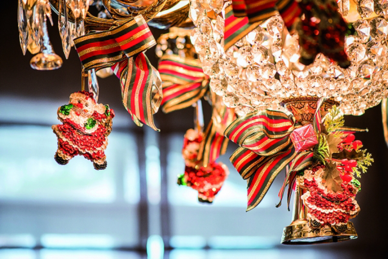 Todos os enfeites conversam entre si. Os passarinhos do arranjo de porta foram parar também no pinheirinho, ornamentado com pequenos pacotes de presente e com uma revoada de borboletas brilhantes. As mesmas, aliás, que seguram os guardanapos da mesa de jantar. Por lá, elas compõem durante a noite com um jogo de louças usado só em ocasiões especiais e que foge à temática natalina, velas e anjinhos, que sobem até ao lustre. De dia, as louças são trocadas e ganham papais-noéis e outros enfeites. “Valorizo muito o café da manhã, por isso, aqui, em dezembro sempre sentamos à mesa com decorações temáticas e inspiradoras”, diz. E junto dessa turma, fitas verdes, vermelhas e douradas, ornamentos em paetê e guirlandas. Eles vão também ao lavabo e à cozinha, entre panelas e temperos.