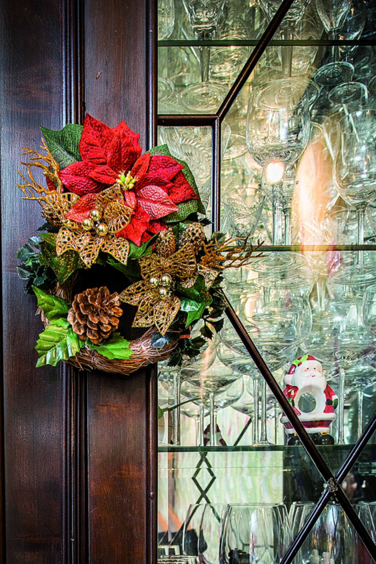 Ilse Lambach abriu as portas de casa para mostrar uma tradição repetida todos os anos. Decorar cada cômodo da casa, com objetos guardados durante os anos, novas aquisições e peças feitas por ela mesma. Como, por exemplo, o arranjo da porta de entrada, feito à mão com fibras naturais e enfeites dourados. Um oratório reluzente dá as boas-vindas aos visitantes com o tom da espiritualidade que envolve a data. “Gosto de trazer tradição e história para as minhas decorações. O Natal é uma época que pede esse resgate”, comenta. Da cozinha aos quartos, ela faz questão que cada ambiente ganhe um novo detalhe, que pode ser uma vela, guirlanda, bolas de pinheirinho e enfeites bordados distribuídos por potes e maçanetas de portas.
