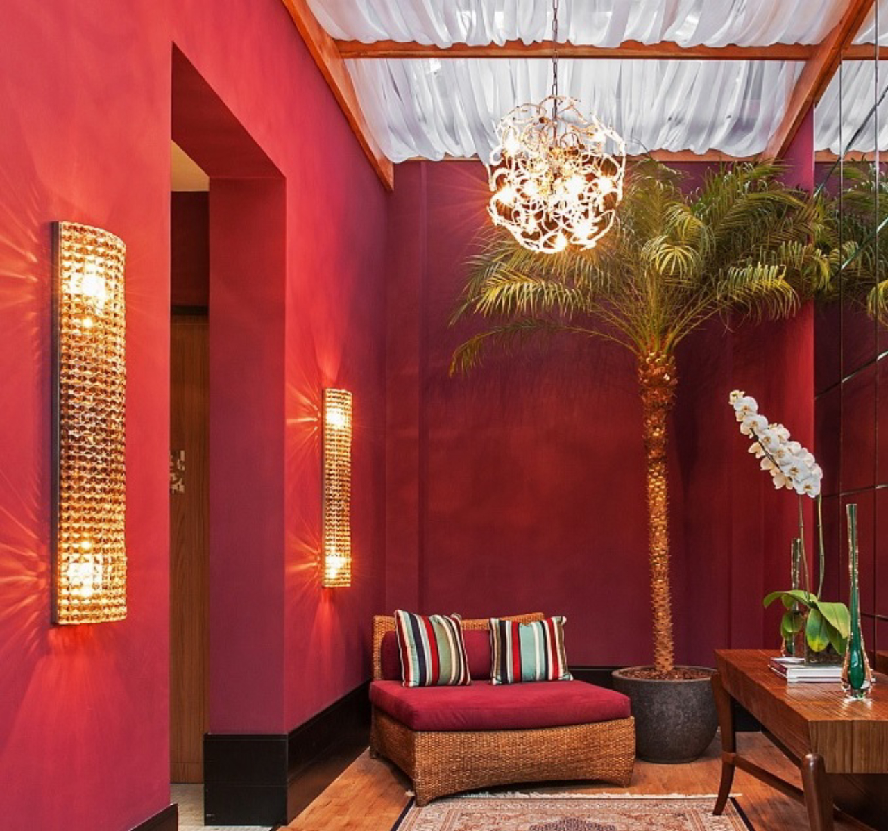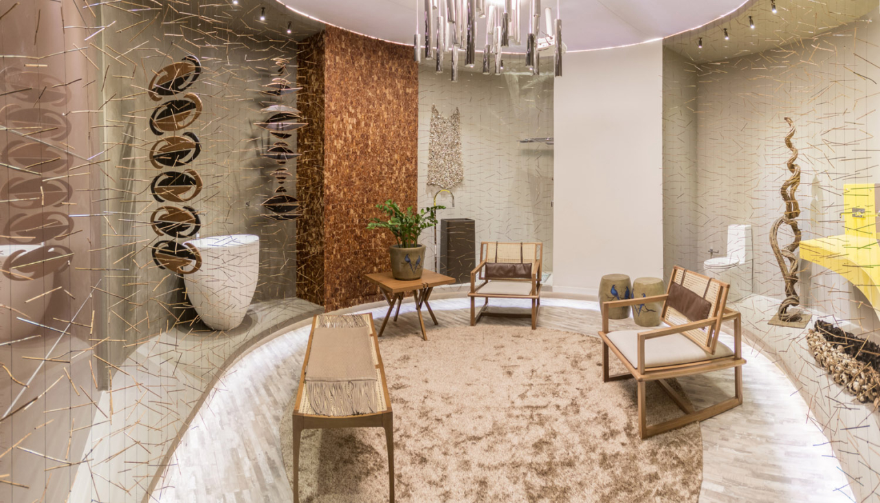 Para o ambiente Banheiros Públicos, da arquiteta Simone Stolfa, a Luna Luce executou duas grandes arandelas de cristal Honey Asfour, as quais chamam atenção pelo brilho e beleza. Foto: Divulgação