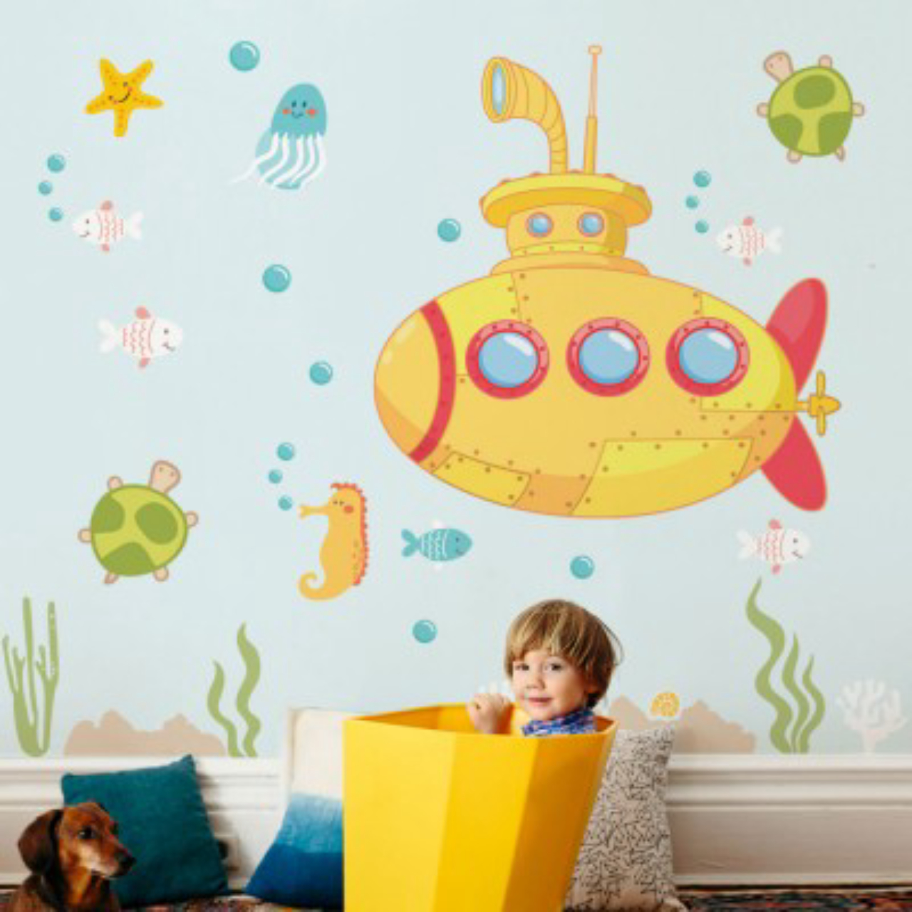Os adesivos de parede talvez sejam o item mais versátil para montar uma decoração temática! Sem precisar de mão de obra especializada para aplicar, eles transformam uma parede azul no fundo do mar. O cartela temática de oceano vem com o submarino, tartarugas, peixes e outros bichinhos. Na Grudado, R$129.
