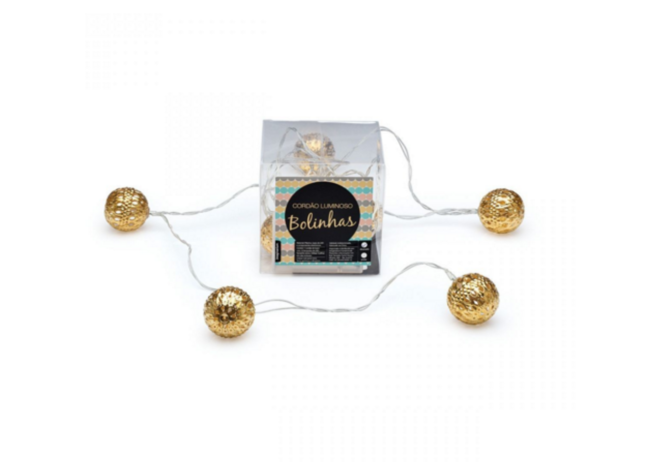 A decoração com luzinhas de Natal está em alta! As bolinhas douradas são um toque delicado e podem enfeitar o berço, a cama, a escrivaninha… Funciona com 3 pilhas AA. Na Imaginarium, R$ 79,90.
