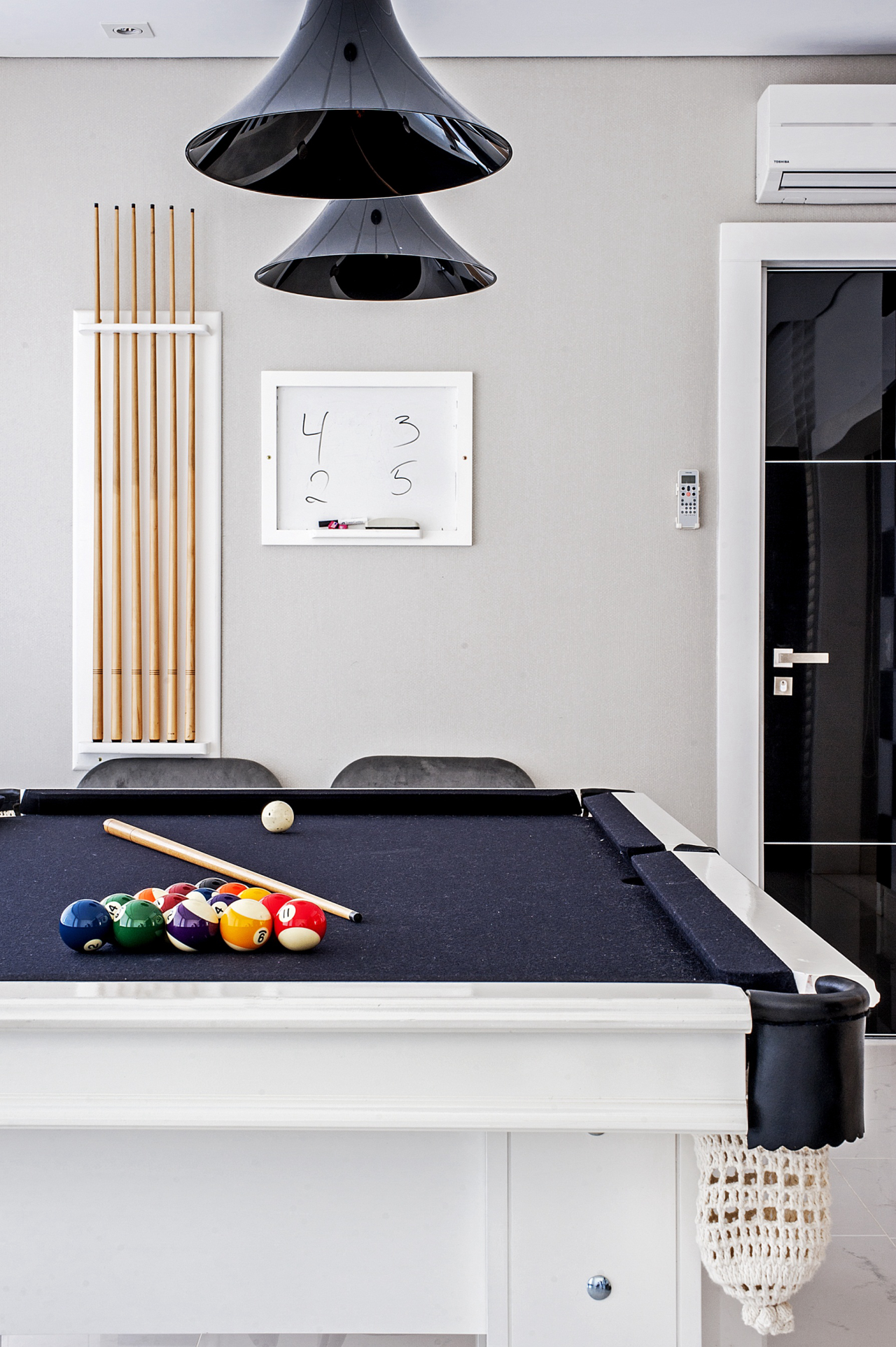 Projeto contemporâneo do espaço gourmet e da sala de jogos, que prima pelo preto, branco, cinza e prata, do arquiteto Luiz Maganhoto e do designer Daniel Casagrande. Fotos: Rodrigo Ramirez/Divulgação