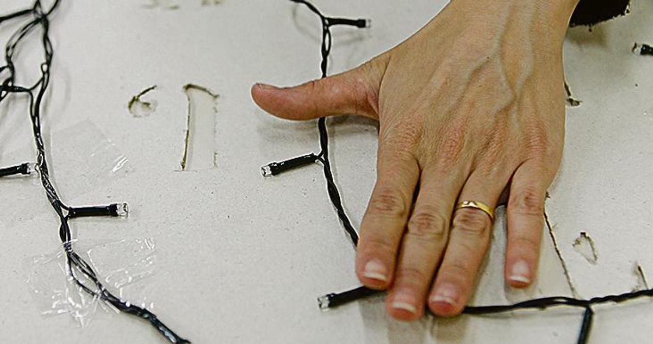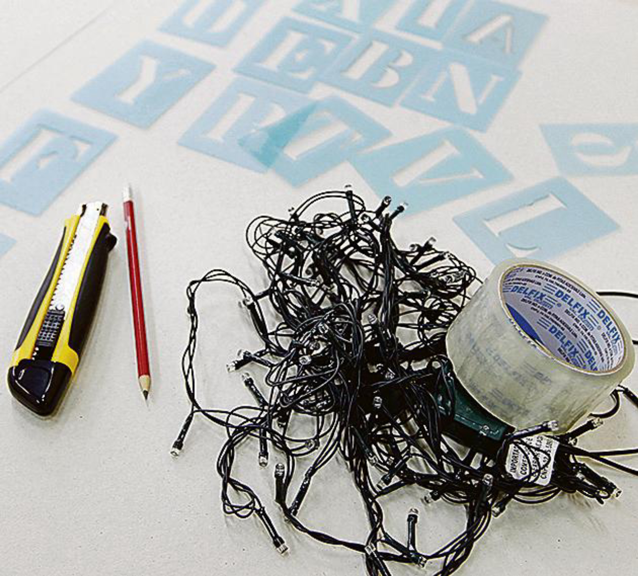 Fixe as luzes de natal atrás do painel com a fita adesiva. Faça a distribuição de forma uniforme. Depois é só ligar na tomada e apoiar o painel em um aparador ou estante. O efeito é incrível.