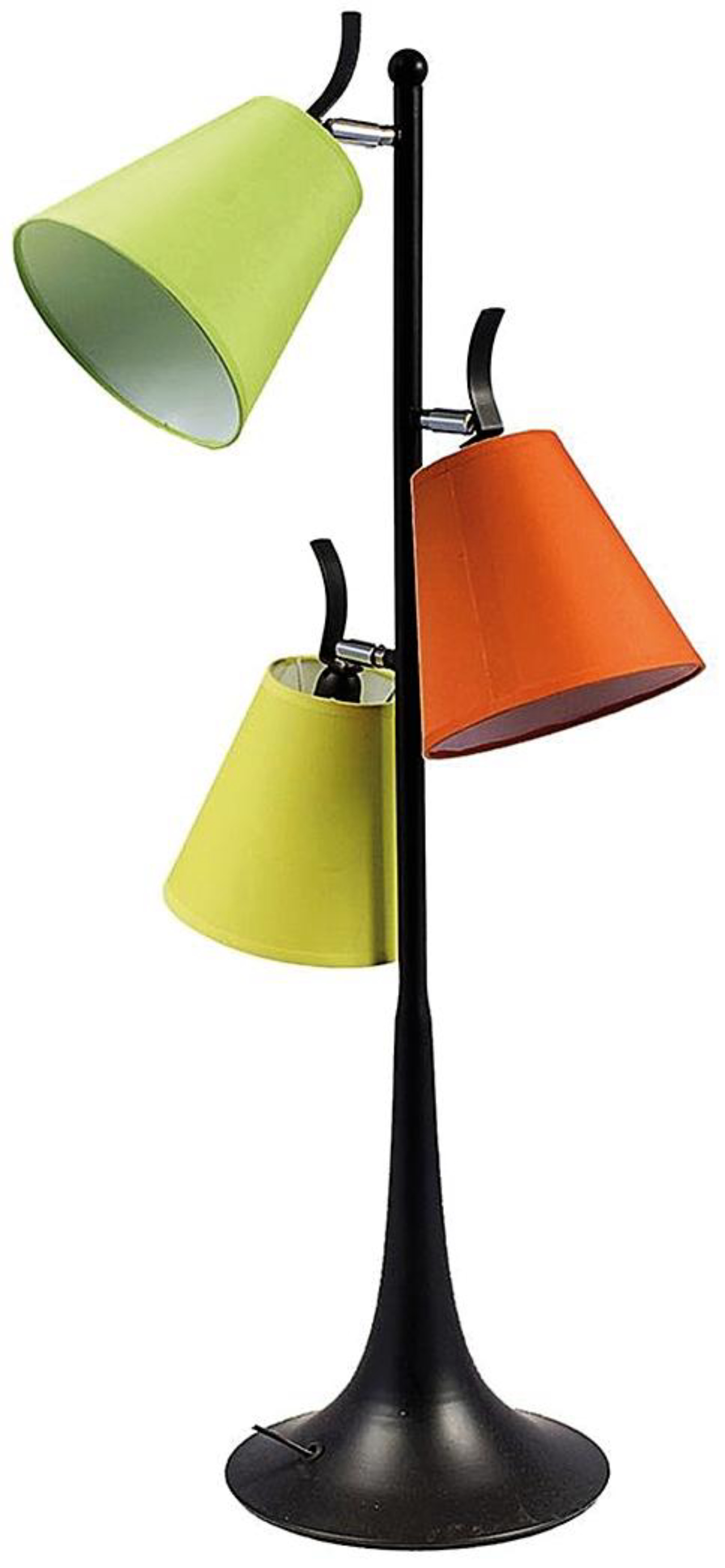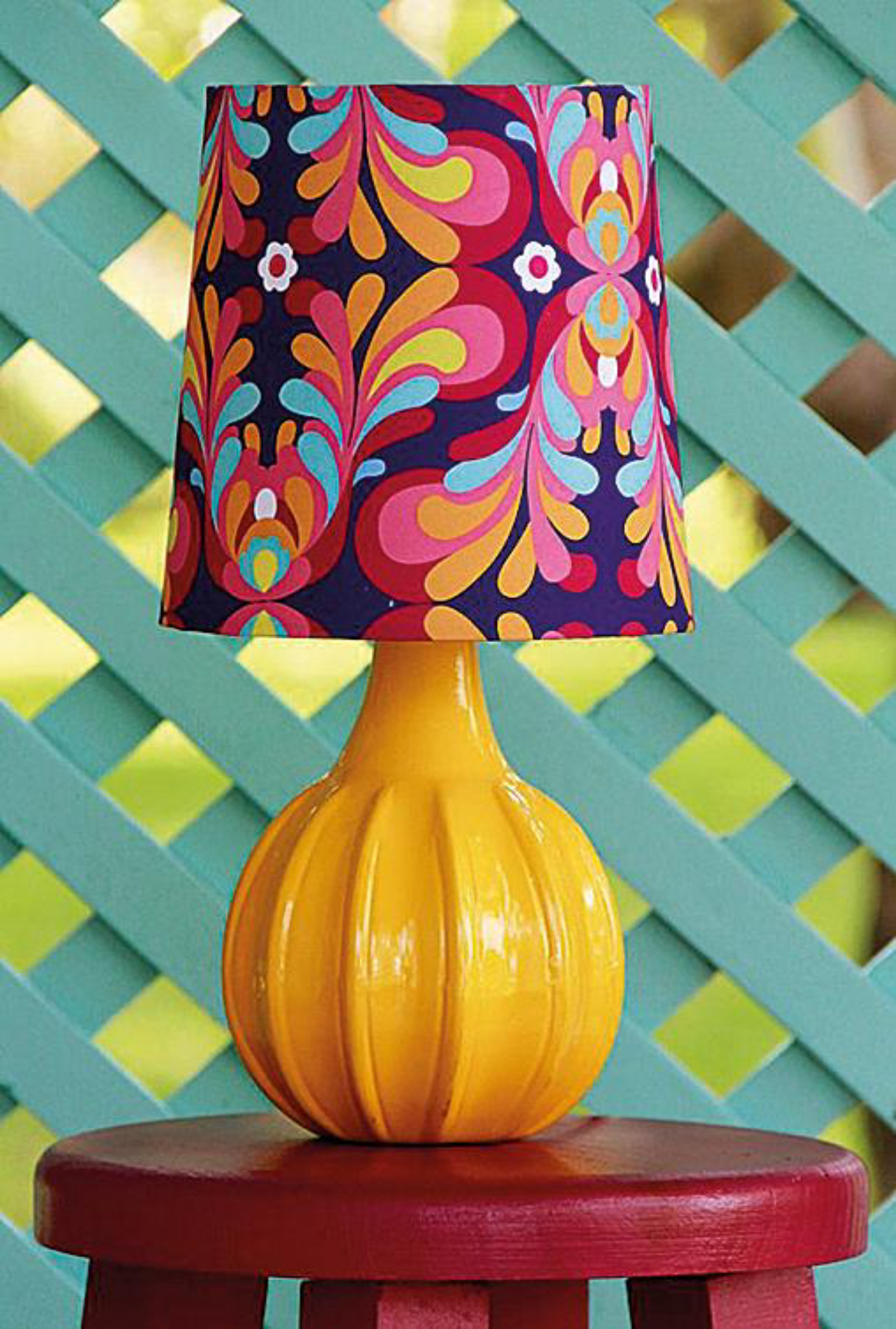 Abajur bojudo com base em cerâmica amarela e cúpula em tecido colorido. Na Santa Composição, R$ 345.