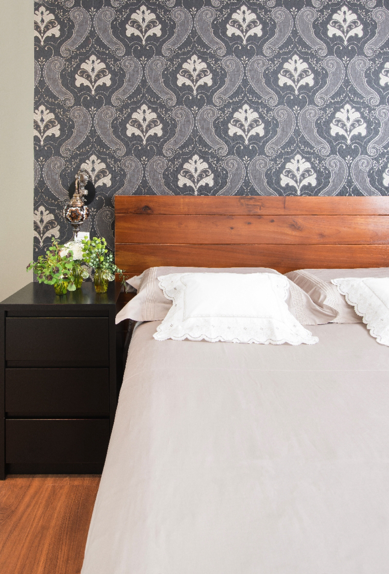 Como a madeira de demolição é marcante, Fabíola decorou o restante do quarto tendo ela como foco. O papel de parede escuro e com detalhes laranjados contrastam com o anteparo, assim como os criado-mudos, mais simples, para não competirem com a madeira de demolição.