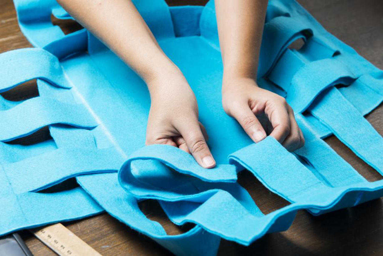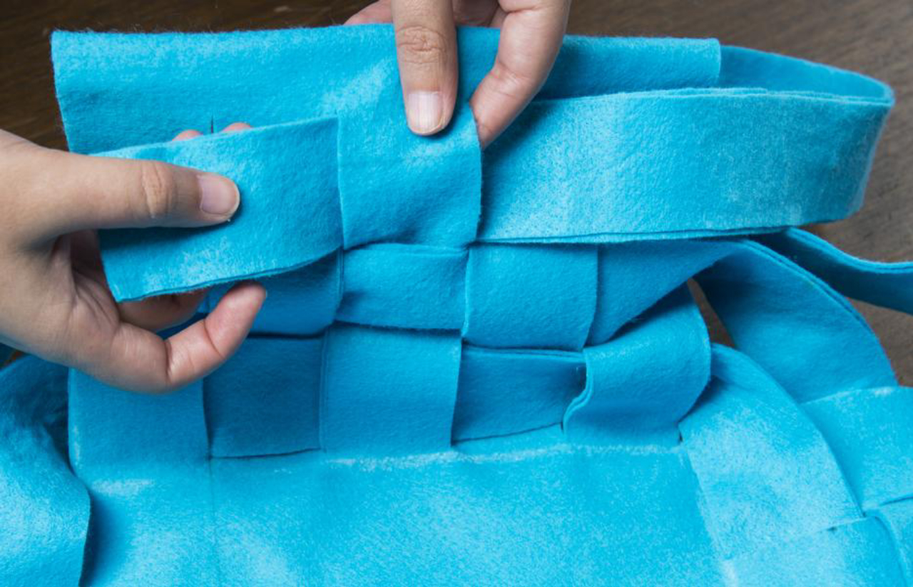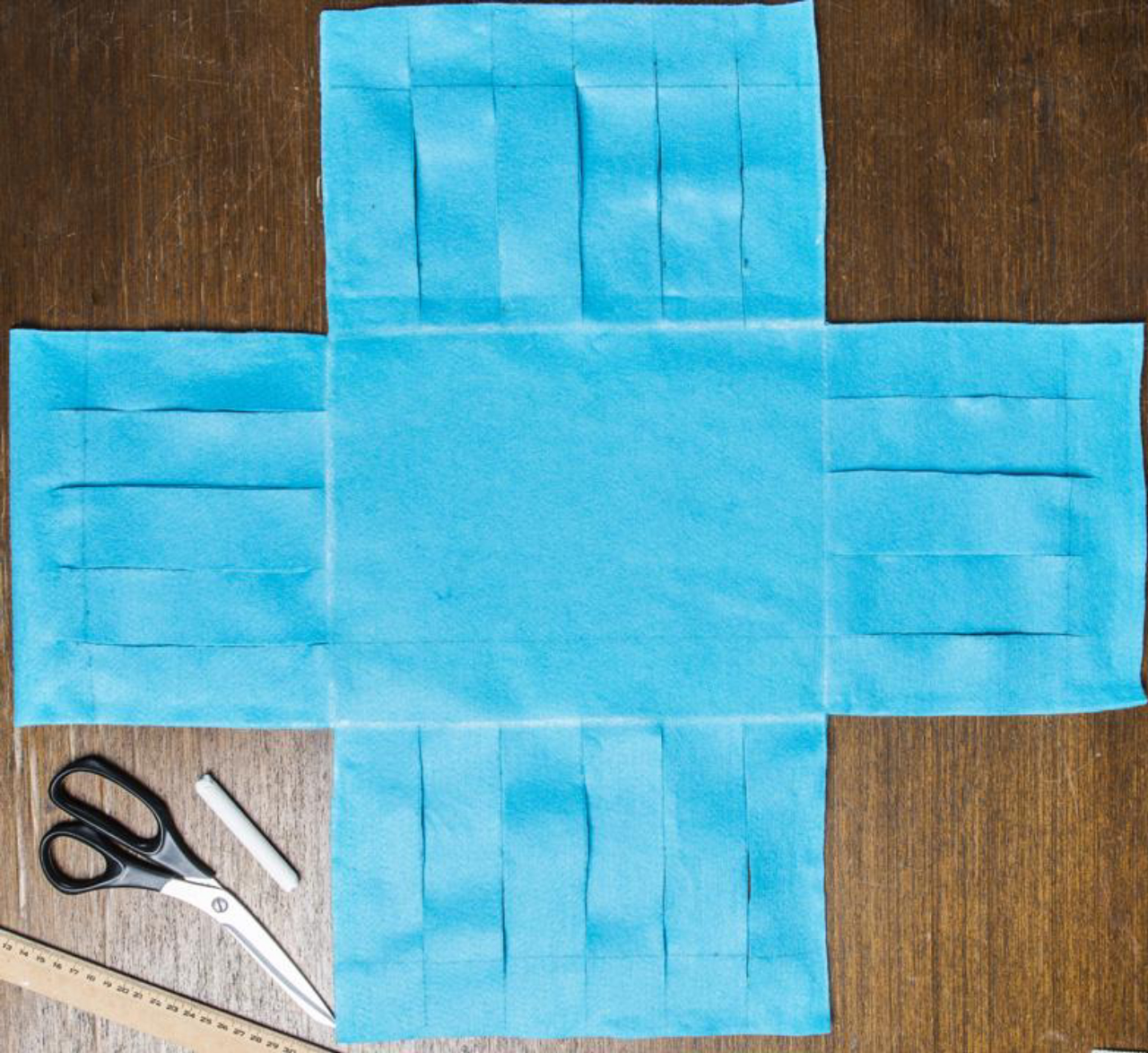 Passo 1 – Desenhe e recorte seis tiras de 100 cm x 4,5 cm. Como o tecido é muito fino, cole duas tiras juntas para criar uma camada dupla de feltro. Reserve.
