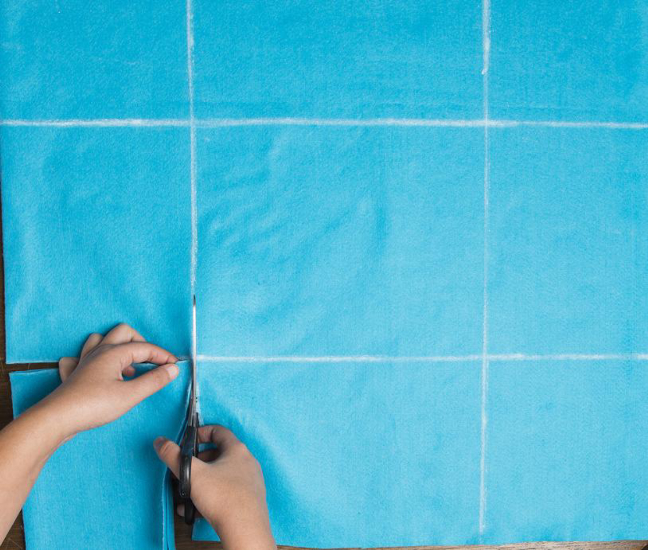Passo 2 – Recorte um retângulo – com camada dupla de tecido – de 63,5 cm x 56 cm e desenhe, com a ajuda do giz, três colunas e três linhas. Esteja atento para que o retângulo central tenha 27,5 cm x 20 cm. Os quadrados dos cantos, que devem ser recortados, precisam medir 18 cm x 18 cm.