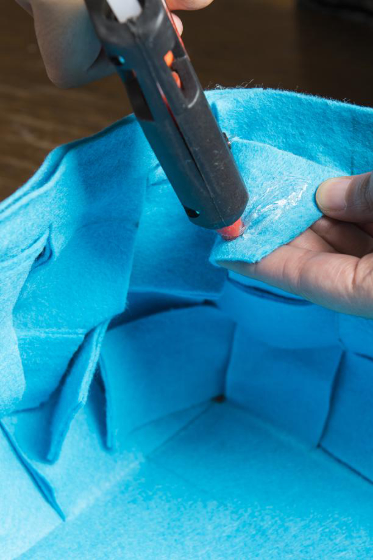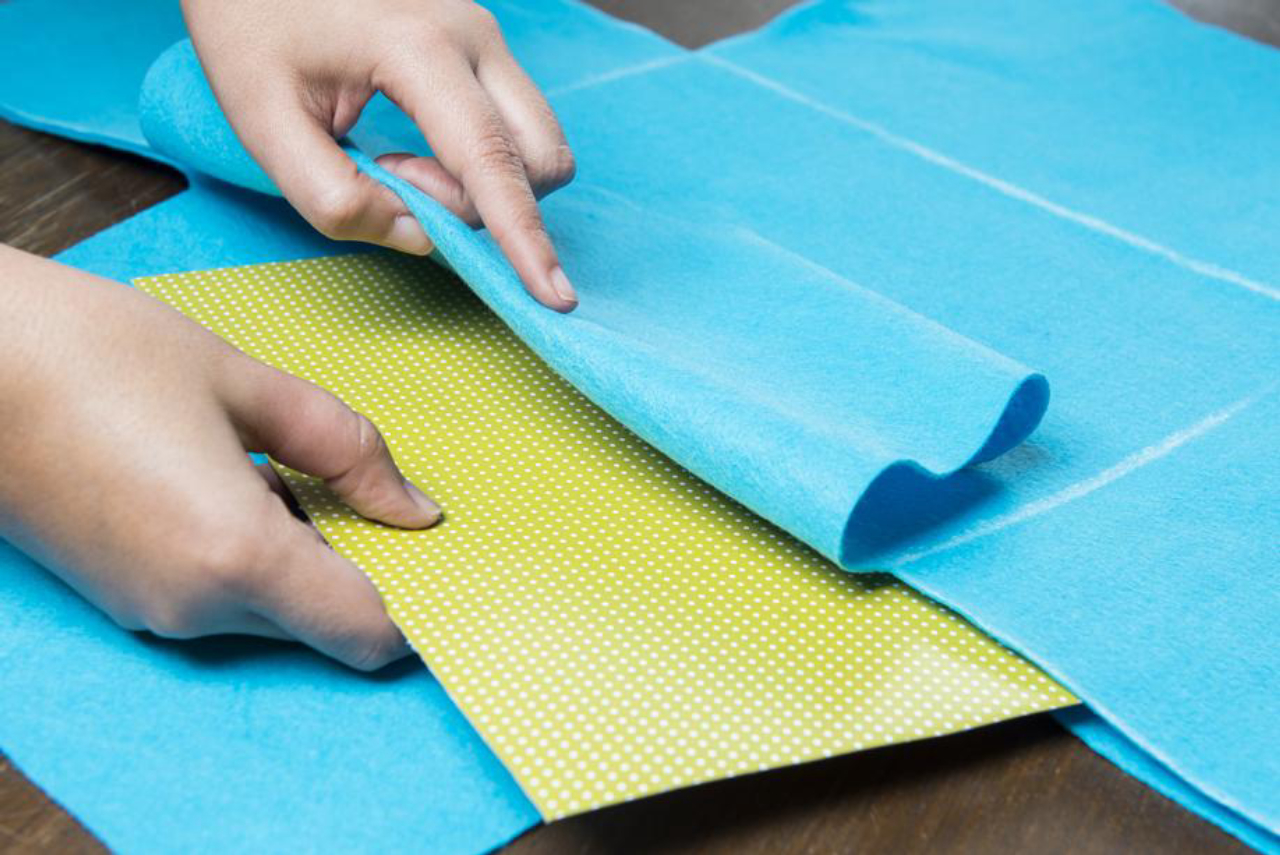 Passo 3 – Use um pedaço da caixa de papelão para fazer a base do cesto e cole as duas camadas do feltro com a cola quente. Esteja atento para colar somente as bordas do tecido.