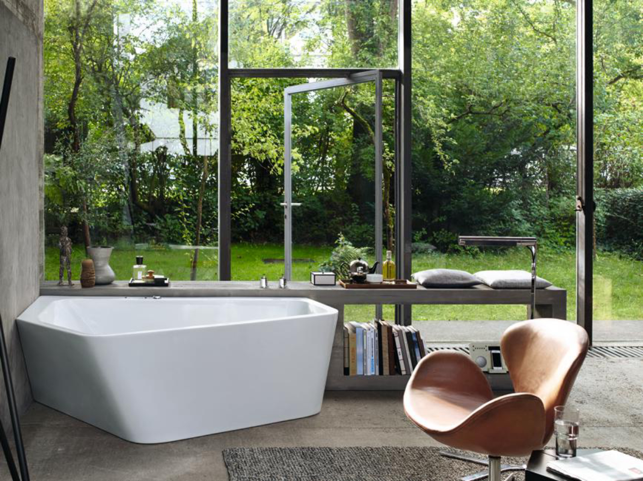 A banheira Paiova 5 tem design todo especial. Criada pelo estúdio austríaco EOOS para a Duravit, a peça tem forma geométrica inspirada numa versão wall-hugging, que cerca a pessoa como um abraço. A banheira luxuosa tem sistema de jato plano que gira a água para cima e para baixo, massageando as costas para um perfeito relaxamento.