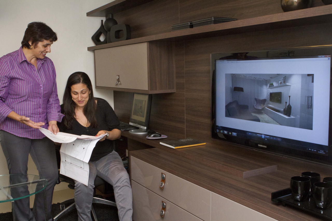 Eunice (de pé) discute um projeto com a arquiteta Alessandra Monteiro