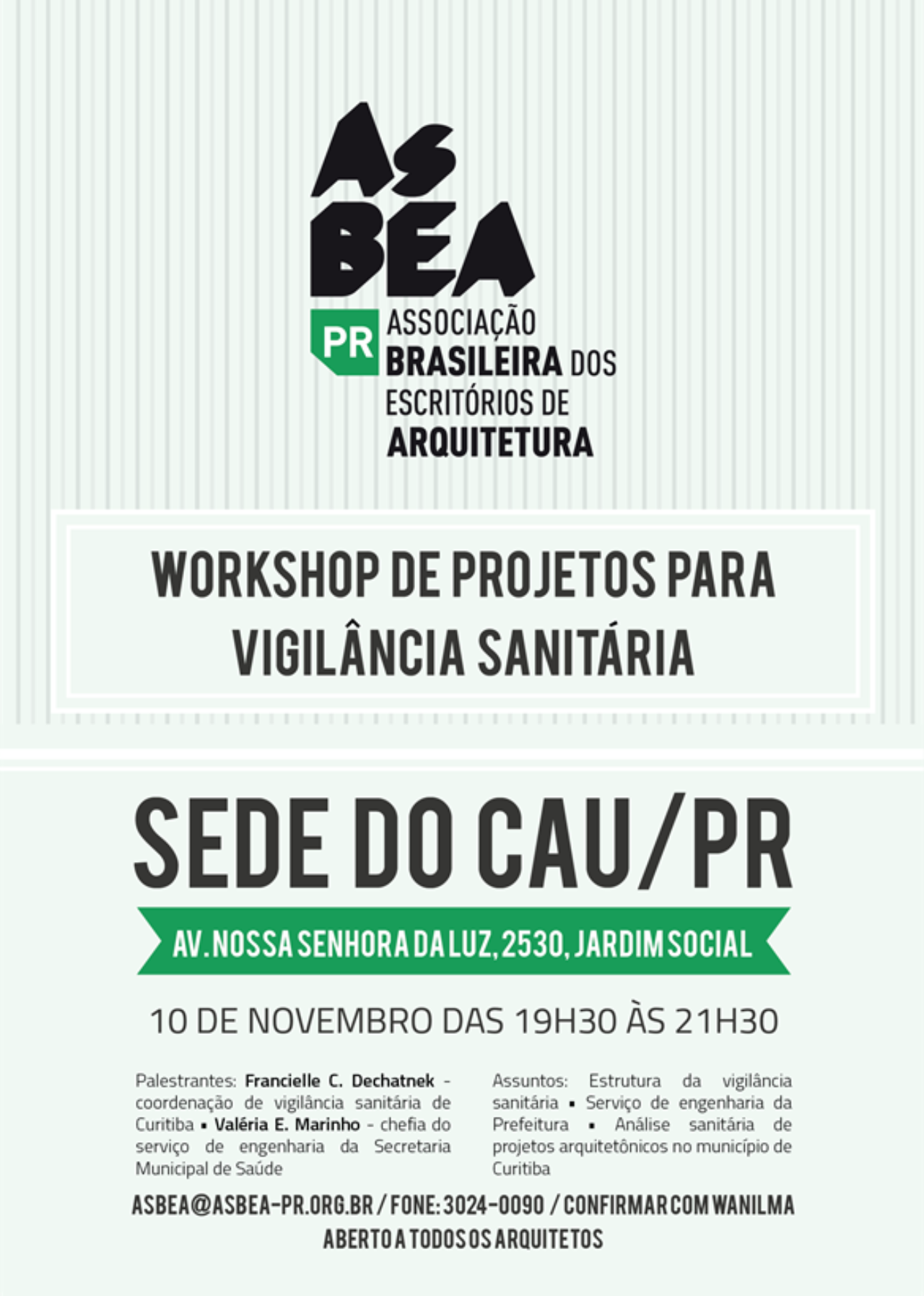 Confirme sua presença pelo e-mail asbea@asbea-pr.org.br ou pelo telefone (41) 3024-0090.