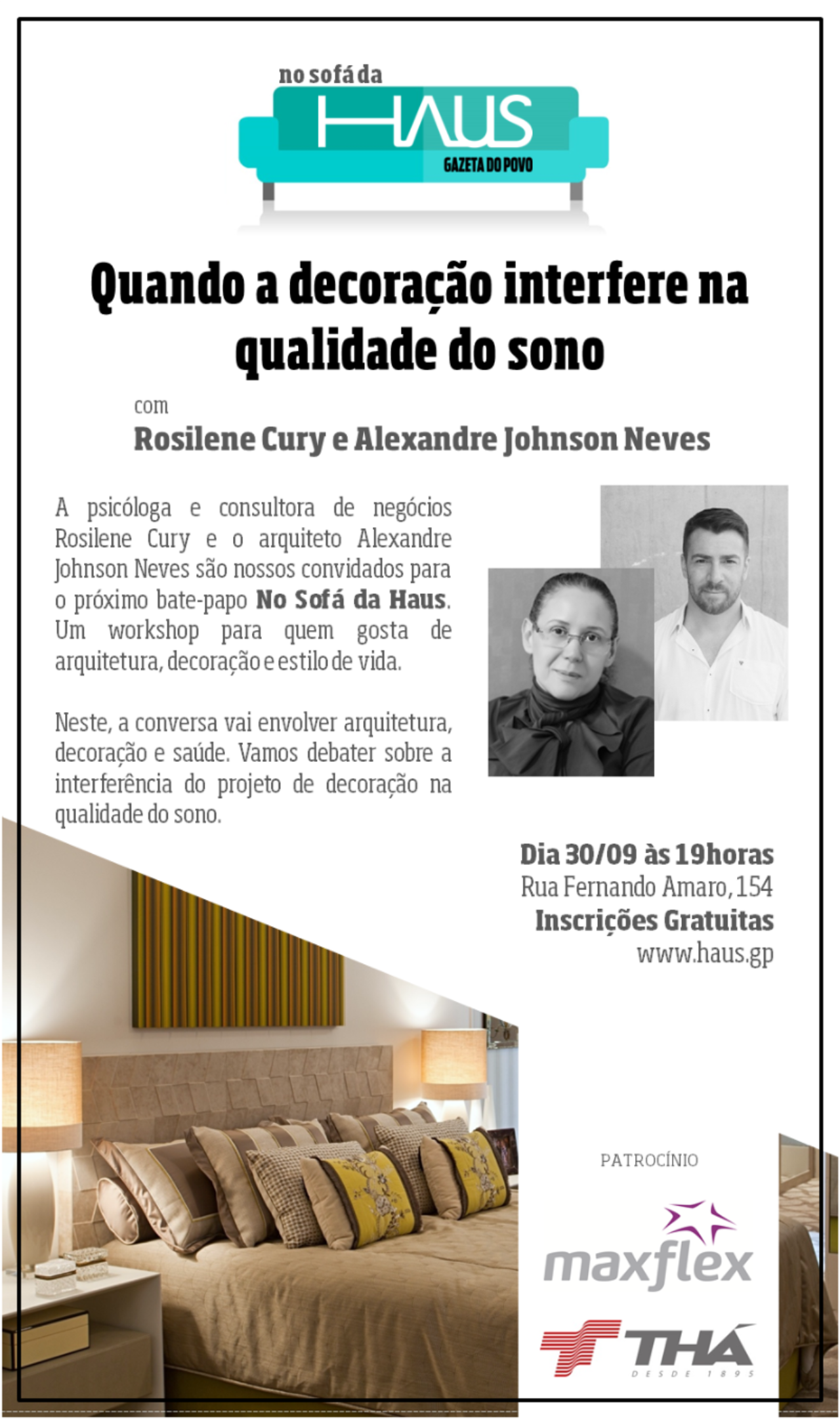 Quer saber se o seu quarto é amigo do descanso? Então venha participar do segundo No Sofá da Haus com o tema “Quando a decoração interfere na qualidade do sono”. Nossos convidados são a psicóloga e consultora de negócios da Maxflex Rosilene Cury e o arquiteto Alexandre Johnson Neves.