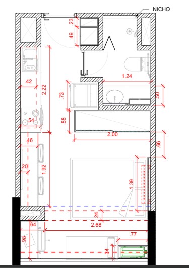 A planta baixa revela a realidade do espaço: um studio compacto, com uma área de varanda e o banheiro. As dimensões exigiram que cada centímetro fosse pensado com precisão, desde a colocação do chuveiro e do vaso sanitário até a disposição da marcenaria embutida. Esse Projeto de Interiores Studio Brooklin em São Paulo prova que, com um planejamento de arquitetura detalhado e a escolha certa de materiais, é possível criar um lar luxuoso e funcional, mesmo em uma área limitada.